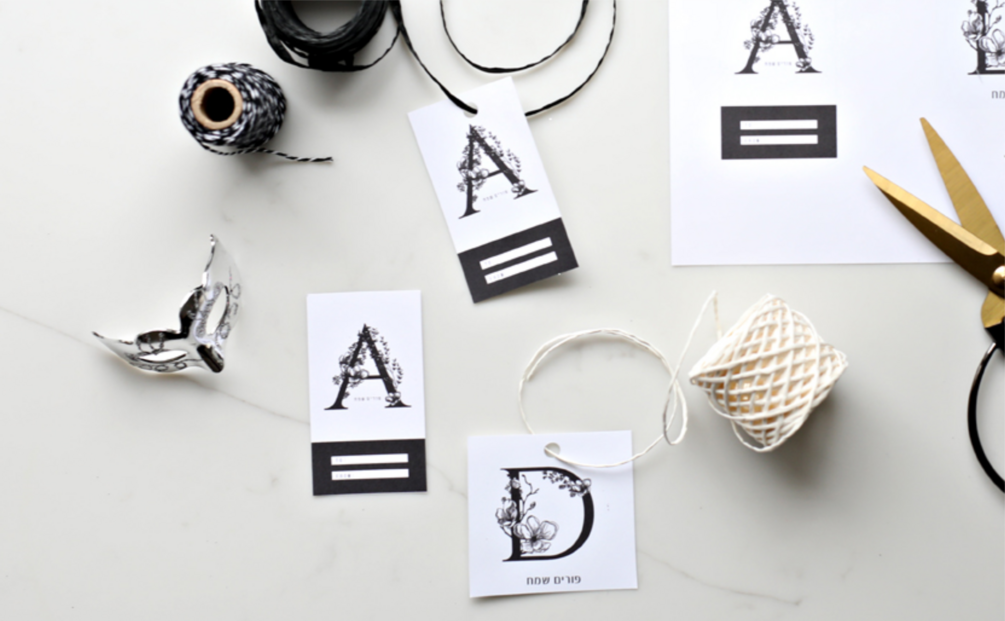 Choose your letter and you’ll receive a printable PDF including 9 2.6" x 3.5" monogrammed gift tags available for download after purchase for just $5! Print them out on cardstock of your choice to complement your mishloach manos.